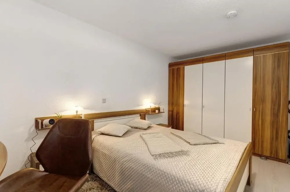 Bett: nur 2 Dekokissen ohne Bezug und 3 Dekodecken. Keine Daunen, keine Laken, nur ein dünner Bezug über der Matratze. Bezüglich Komfort und Hygiene ist das nicht in Ordnung.